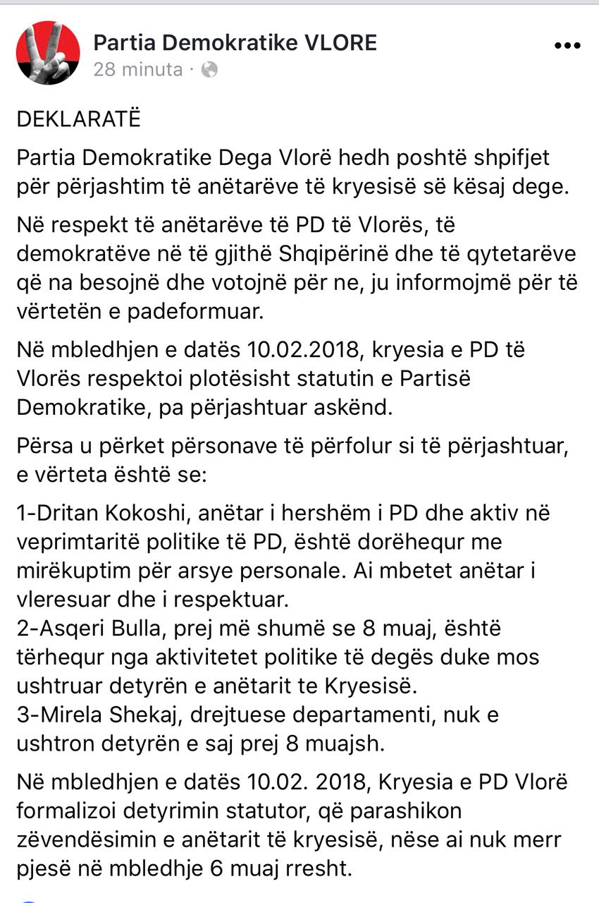 Në mbledhjen e datës 10. 02. 2018, kryesia e PD të Vlorës respektoi plotësisht statutin e Partisë Demokratike, pa përjashtuar askënd.
