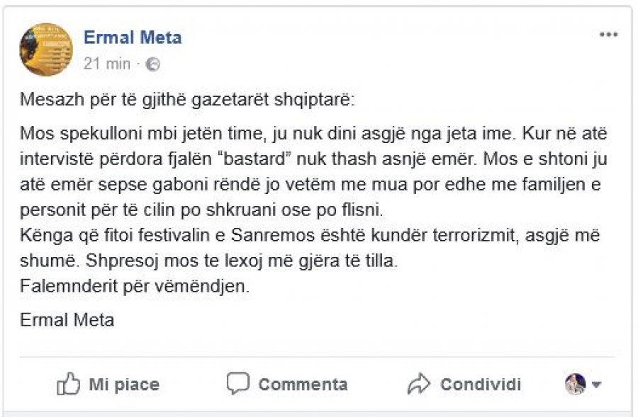 Ermal Meta, këngëtari  shqiptar, fitues i “Sanremo”-s, ka “folur” shqip duke adresuar një mesazh për të gjithë mediat dhe gazetarë shqiptarë.