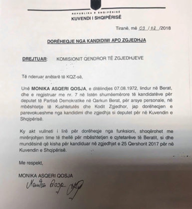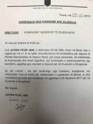 Dy kandidatet gra në listat e Partisë Demokratike në Qarkun e Beratit, Juvina Jani dhe Monika Qosja, kanë depozituar zyrtarisht pranë Komisionit Qendror të Zgjedhjeve dorëheqjet nga kandidimi duke refuzuar mandatin e deputetit. Kjo bën që mandati i mbetur i lirë pas dorëheqjes së deputetit Eduard Halimi t’i kalojë biznesmenit, Astrit Veliaj.