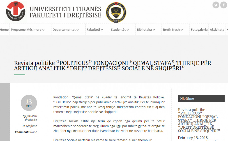 Në website-in e Fakultetit të Drejtësisë, për të cilin është përgjegjës Dekani i Fakultetit, është publikuar një thirrje për pedagogët dhe studentët që të shkruajnë në revistën POLITIKE të Fondacionit POLITIK “Qemal Stafa”, të partisë POLITIKE “Partia Socialiste”.