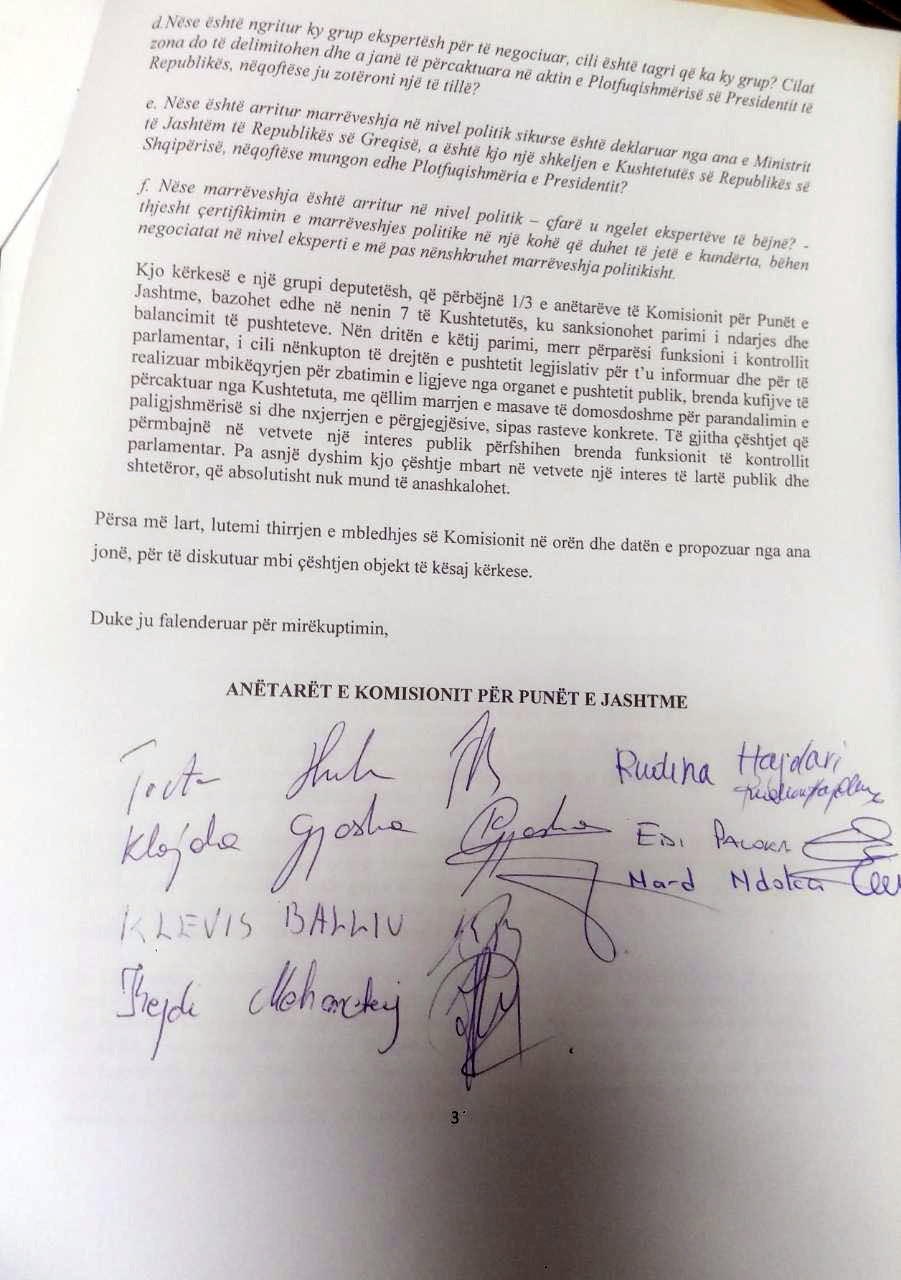 Sipas kërkesës drejtuar kryetares së këtij komisioni deputetët e opozitës argumentojnë se” pyetjet tona lidhen me kushtet e procedurat se kur deklarohet që është arritur apo ka marrë formë marrëveshja (qe do të thotë se është ngritur grupi negociator), janë zhvilluar negociatat, palët në nivel ekspertësh kanë rënë dakord, dhe më pas zhvillohen diskutimet në nivele politike. Gjithashtu këto pyetje bazohen edhe në faktin se nga Presidenti i Republikës deklarohet që deri më tani nuk është dhënë asnjë Plotfuqishmëri për këtë proces shume të rëndësishëm. Kjo u konfirmua edhe nga kërkesa e bere vetëm dje nga Ministri Bushati për të kërkuar Plotfuqishmërinë…”.