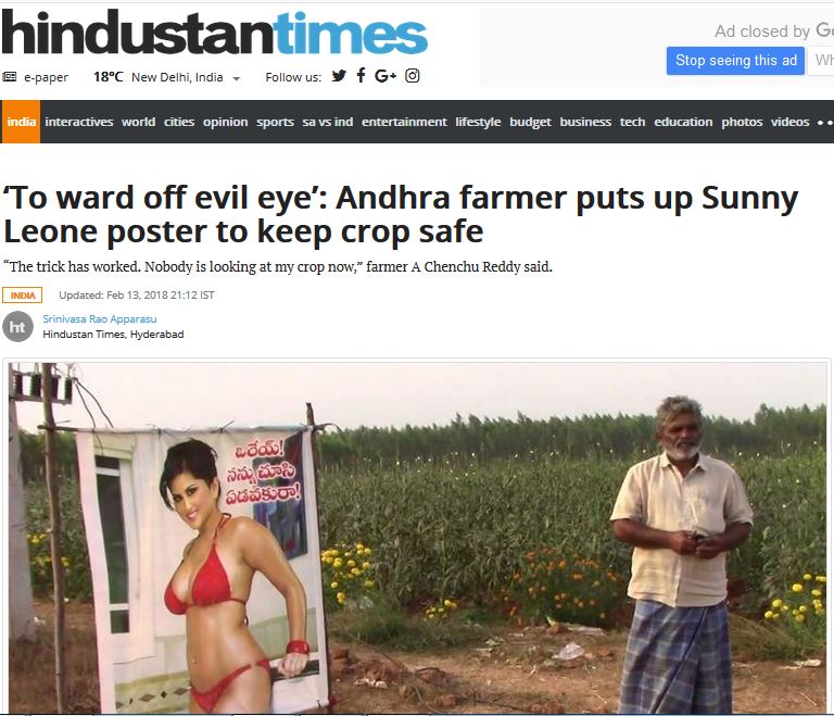 India njihet si vendi i çudirave. Në të njëjtën linjë janë edhe veprimet e fermerit, Chenchu Reddy, i cili ka vendosur posterin e një pornostareje të famshme në vend për t’i “ruajtur” të korrat nga syri i keq.