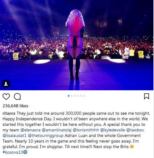 Fill pas koncertit ajo ka postuar: “Ata vetëm më thanë se rreth 300 mijë njerëz dolën të më shohin sonte. Gëzuar ditën e pavarësisë. Unë nuk do të isha kudo tjetër në botë. Ne e filluam këtë së bashku, nuk do të isha këtu, pa ju. Gati dhjet vjet në këtë lojë dhe kjo ndjenjë kurrë nuk shuhet. Jam mirënjohëse. Unë jam krenare. Unë jam shqiptare. Deri herën tjetër!!! Ndalesa e radhës Brit Aëards”, ka shkruar Rita në Instagram.