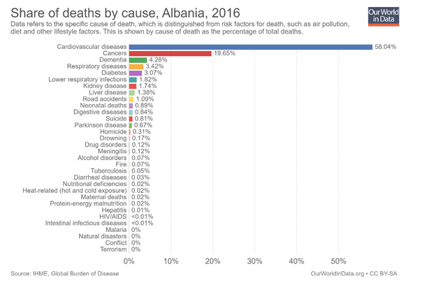 Sipas të dhënave më të fundit të Our World in Data, për çdo 100 vdekje në Shqipëri, 58 shkaktohen nga sëmundjet kardiovaskulare, 19 prej tumoreve, 4 prej diabetit, 3 prej sëmundjeve mendore, 1 prej infeksioneve në rrugët e frymëmarrjes, 1 prej aksidenteve rrugore, dhe 10 prej shkaqeve të tjera.