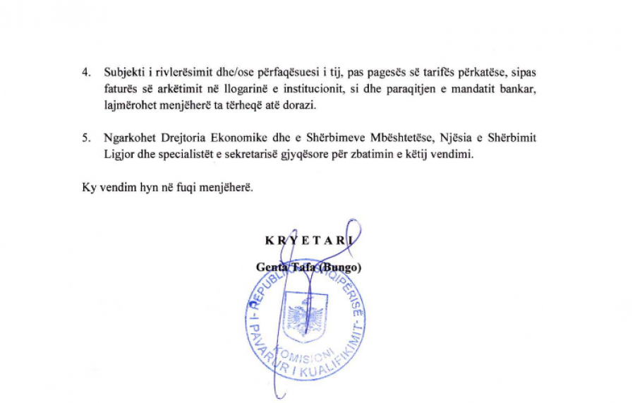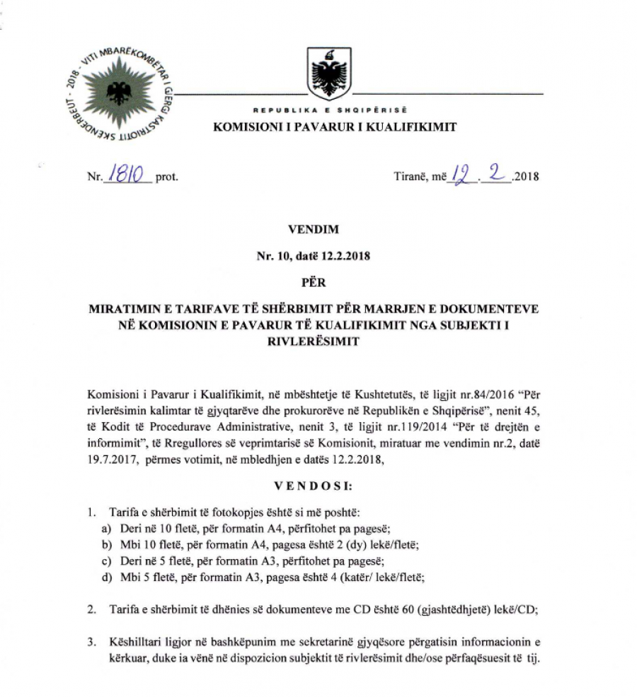 Në vendimin e fundit thuhet se KPK, në mbështetje të Kushtetutës, të ligjit nr. 84/2016 “Për rivlerësimin kalimtar të gjyqtarëve dhe prokurorëve në Republikën e Shqipërisë”, nenit 45, të Kodit të Procedurave Administrative, nenit 13, të ligjit nr. 119/2014 “Për të drejtën e informimit”, të Rregullores së veprimtarisë së Komisionit, miratuar me vendimin nr. 2, datë 19. 07. 2017, njofton se me vendimin nr. 10, datë 12. 02. 2018 ka miratuar tarifat e shërbimit për marrjen e dokumenteve në Komisionin e Pavarur të Kualifikimit nga subjekti i rivlerësimit.