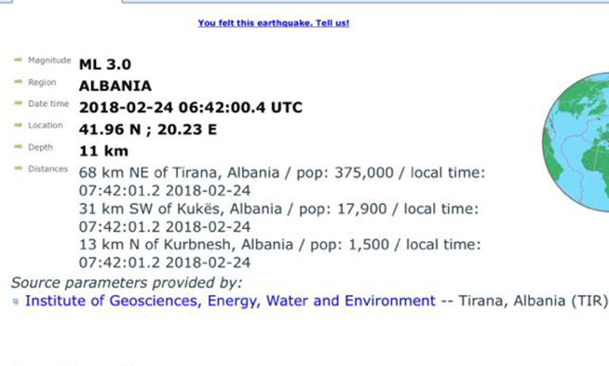 Një lëkundje e lehtë tërmeti, me magnitudë 3, është ndierë pak pas orës 7:30 të mëngjesit të kësaj të shtunë në verilindje të Shqipërisë.