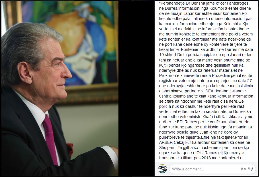 “Pershendetje Dr Berisha jame oficer i antidroges ne Durres.Informacioni nga Kolumbi a eshte dhene qe ne muajin Janar kur eshte nisur kontenieri.Po keshtu edhe pala Italiane ka dhene información pasi ka marre información edhe ajo nga Kolumbi a.Kjo vertetimet me fakt in se información i eshte dhene me numrin konkrete te kontenierit dhe policía vetem kete kontenier ka kontrolluar ate nate nderkohe qe ne port kane qene edhe dy konteniere te tjere te kesaj firme .Kontenieri ka ardhur ne Durres me date 19 shkurt.Dmth policia shqiptar qe nga Janari e deri tani ka hetuar dhe e ka marre vesh shume mire se kujt i perket kjo ngarkese dhe qellimisht nuk ka nderhyre dhe as nuk ka referuar materialet ne Prokurori e krimeve te renda.Procedimi penal eshte regjistruar vetem nje nate para ngjarjes me date 27 dhe nderhyrja eshte bere po kete date me insistimin e sherbimeve partnere si DEA.dogana Italiane e ushtria kolumbiane te cilat kane kerkuar información se cfare ka ndodhur me kete rast disa here.Qe policía nuk ka dashur te nderhyre per kete rast vertetimet edhe me faktin se ate nate ne Durres ka qene edhe vete ministri Xhafa i cili Ka shkuar aty me urdher te EDI Rames per te verifikuar situaten .Ne fund kur kane pare se nuk kishin nga tía mbanin ka nderhyre policía duke Juan lene ne dore dy punetoreve te thjeshte.Efhe nje fakt tjeter.Pronari ARBER Cekaj kur ka ardhur kontenieri ka qene ne Shqiperi.. Te gjitha sa thashe me siper i bie qe kjo ngarkese ka qene e Olsi Rames etj.Kjo menyre transporti ka filluar pas 2013 me kontenieret e bananeve.Mbrojtja e tyre ne Durres behej nga Ish Drejtor i policise Durres Perlat Cullaj I cili ishte I vetmi Drejtor policía qe nuk levizi nga Durresi per 4 vjet me radhe”.