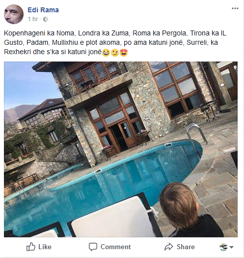 Kryeministri ka postuar sot një foto të një pishine dhe hoteli në afërsi të shtëpisë së tij në Surrel. Behet fjalë për kompleksin ‘rexhekri’ i ndërtuar me mjaft shije por që vitet e fundit i ka rënë xhiro për shkak të rënies së nivelit të jetesës.
