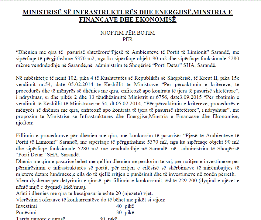 Në njoftimin e qerasë thuhet se hapet gara për dhënien me qera të pasurisë shtetërore“Pjesë të Ambienteve të Portit të Limionit” Sarandë, me sipërfaqe të përgjithshme 5370 m2, nga ku sipërfaqe objekt 90 m2 dhe sipërfaqe funksionale 5280 m2 me vendndodhje në Sarandë,në administrim të Shoqërisë “Porti Detar” SHA, Sarandë”.