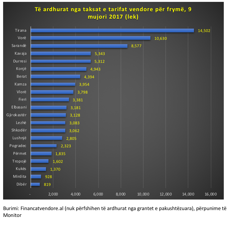 Në vend të parë është Tirana, ku taksat dhe tarifat e mbledhura nga bizneset dhe individët, të llogaritura për frymë arrijnë në 14.5 mijë lekë për 9-mujorin (pa përfshirë grantet e pakushtëzuara nga qeveria).