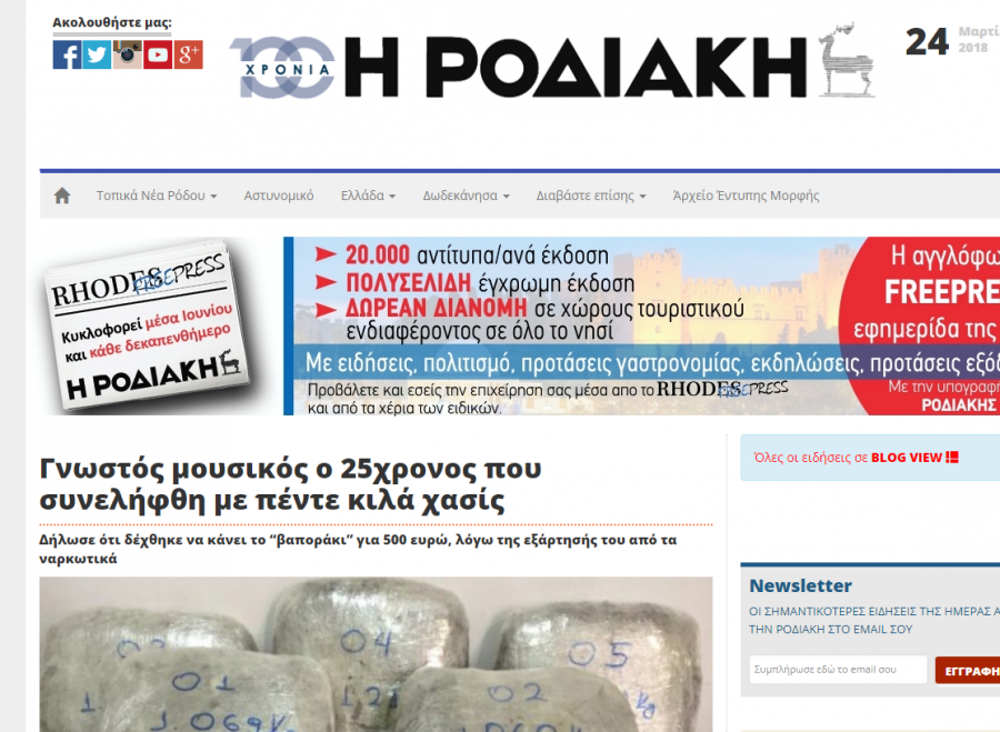 Mediat greke njoftojnë se një muzikant i njohur shqiptar është i përfshirë në trafikun e kanabisit në Greqi. Një sasi prej rreth 5 kg hashash është sekuestruar paraditen e 20 Marsit në Rodos të Greqisë dhe dy persona u arrestuan si transportues të kësaj sasie lënde narkotike, njëri prej të cilëve shqiptar.