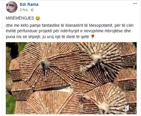 “Mirëmëngjes dhe me këto pamje fantastike të Manastirit të Mesopotamit, për të cilin është përfunduar projekti për ndërhyrjet e nevojshme mbrojtëse dhe puna nis së shpejti, ju uroj një të dielë të qetë”, shkruan Rama në faqen e tij në rrjetet sociale ndërkohë që reagimet kanë qenë tepër të ashpra.