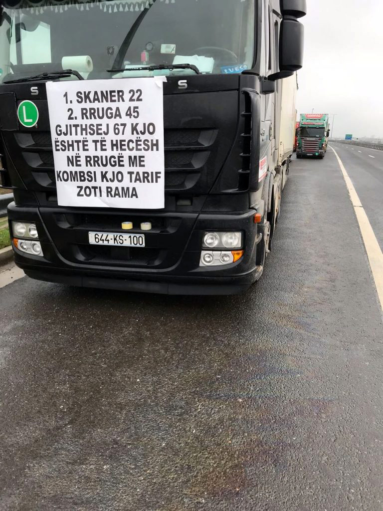 Një shofer kamioni ka zgjedhur të protestojë me anë të një pankarte të vendosur në “ballin” e mjetit të tij, ku i kujton kryeministrit Rama sa kushton të kalosh në një rrugë që lidh dy kombe.