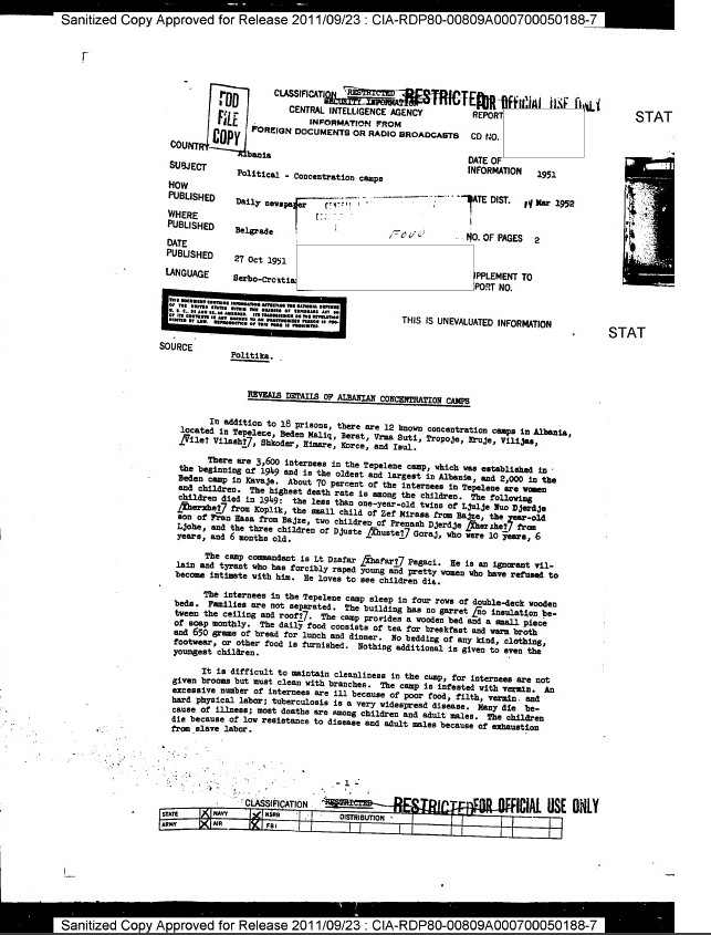 Një dokument i CIA-s i 27 tetorit 1951, i deklasifikuar tashmë, hedh dritë mbi gjendjen në kampin e Tepelenës, ku prej vitit 1949 mbaheshin mbi 3600 të internuar.