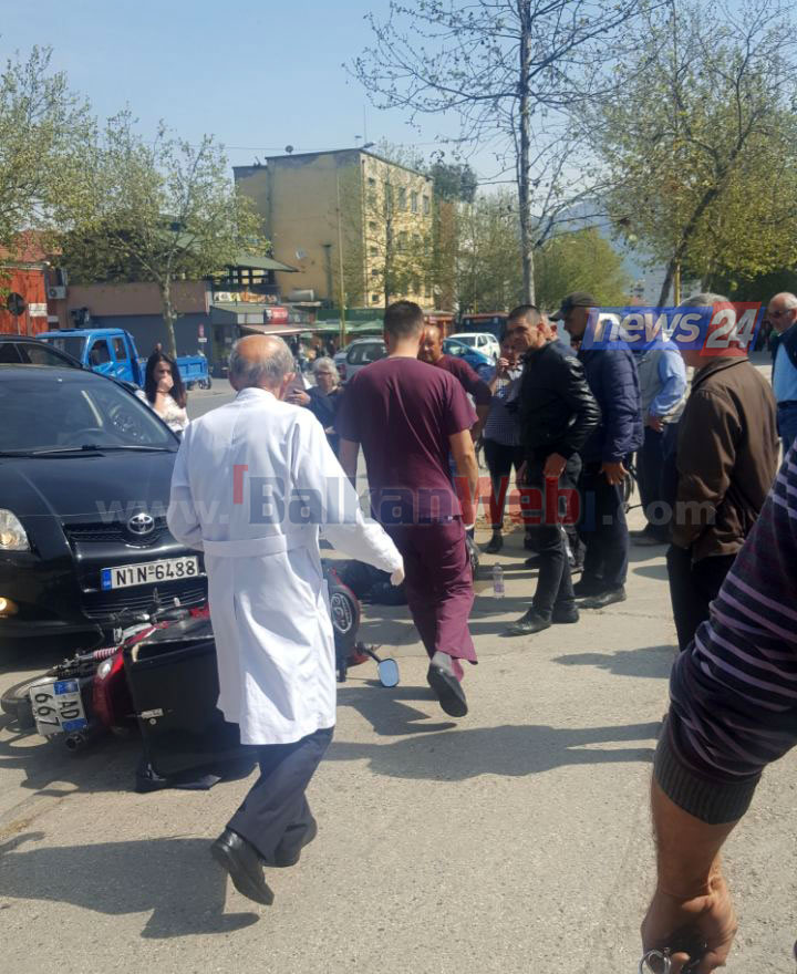 Në foton poshtë, shihet drejtuesi i motorit i shtrirë përtokë, ndërsa pranë vendit të aksidentit janë mbledhur disa qytetarë. Menjëherë në vendngjarje ka mbërritur policia dhe ambulanca, ndërsa një mjek afrohet për t’i dhënë ndihmën e shpejtë.