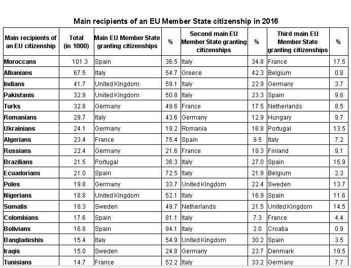 Grupi më i madh që fiton shtetësinë në një shtet anëtar të BE, ku jetonin në vitin 2016, ishin shtetasit e Marokut (101, 300 persona, 89% prej të cilëve kanë marrë shtetësinë e Spanjës, Italisë ose Francës), duke u renditur përpara qytetarëve të Shqipërisë (me 67,500), India me 41,700, më shumë se 60% kanë marrë shtetësi britanike, Turqia (32,800, pothuajse gjysma e fituar shtetësinë gjermane), Rumania (29,700, 44% kanë fituar shtetësinë italiane) dhe Ukraina (24,000, 60% kanë marrë shtetësinë e Gjermanisë, Rumanisë, Portugalisë ose Italisë).