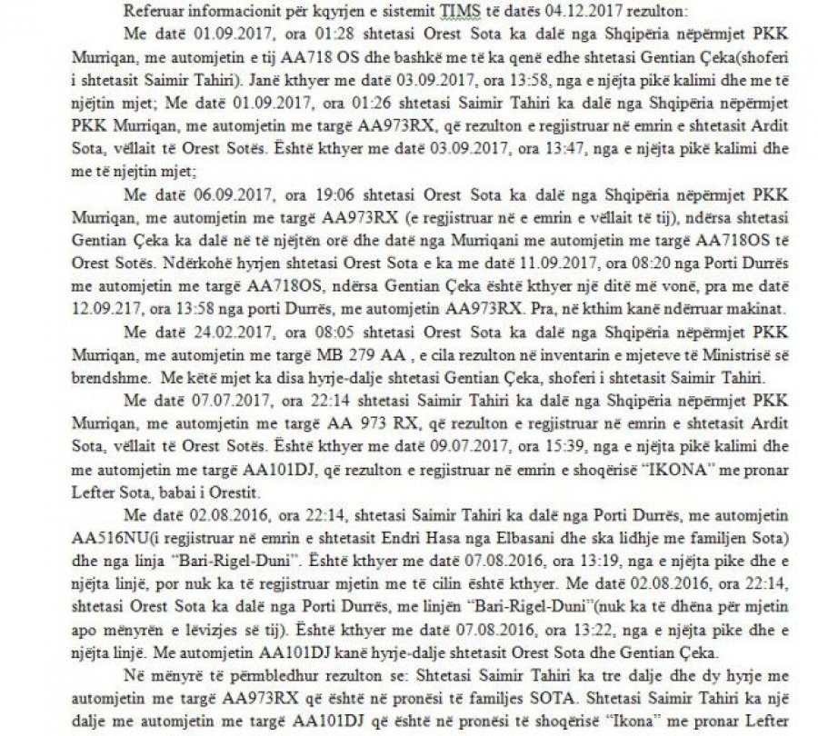 – Më datë 01.09.2017, ora 01:28 shtetasi Orest Sota ka dalë nga Shqipëria nëpërmjet PKK Murriqan, me automjetin e tij AA718 OS dhe bashkë me të ka qenë edhe shtetasi Gentian Çeka (shoferi i shtetasit Saimir Tahiri). Janë kthyer me datë 03.09.2017, ora 13:58, nga e njëjta pikë kalimi dhe me të njëjtin mjet; Me datë 01.09.2017, ora 01:26 shtetasi Saimir Tahiri ka dalë nga Shqipëria nëpërmjet PKK Murriqan, me automjetin me targë AA 973 RX, që rezulton e regjistruar në emrin e shtetasit Ardit Sota, vëllait të Orest Sotës. Është kthyer me datë 03.09.2017, ora 13:47, nga e njëjta pikë kalimi dhe me të njejtin mjet. Pra, Saimir Tahiri rezulton që ka hyrë dhe ka dalë në të njëjtën kohë me Orest Sotën.