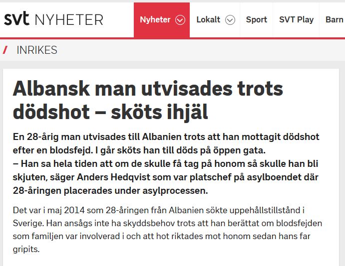 Një 28-vjeçar u dëbua nga Suedia në Shqipëri pavarësisht pranimit të një kërcënimi me vdekje për gjakmarrje. Dje (dy ditë më parë) ai u qëllua për vdekje në një rrugë të Tiranës.