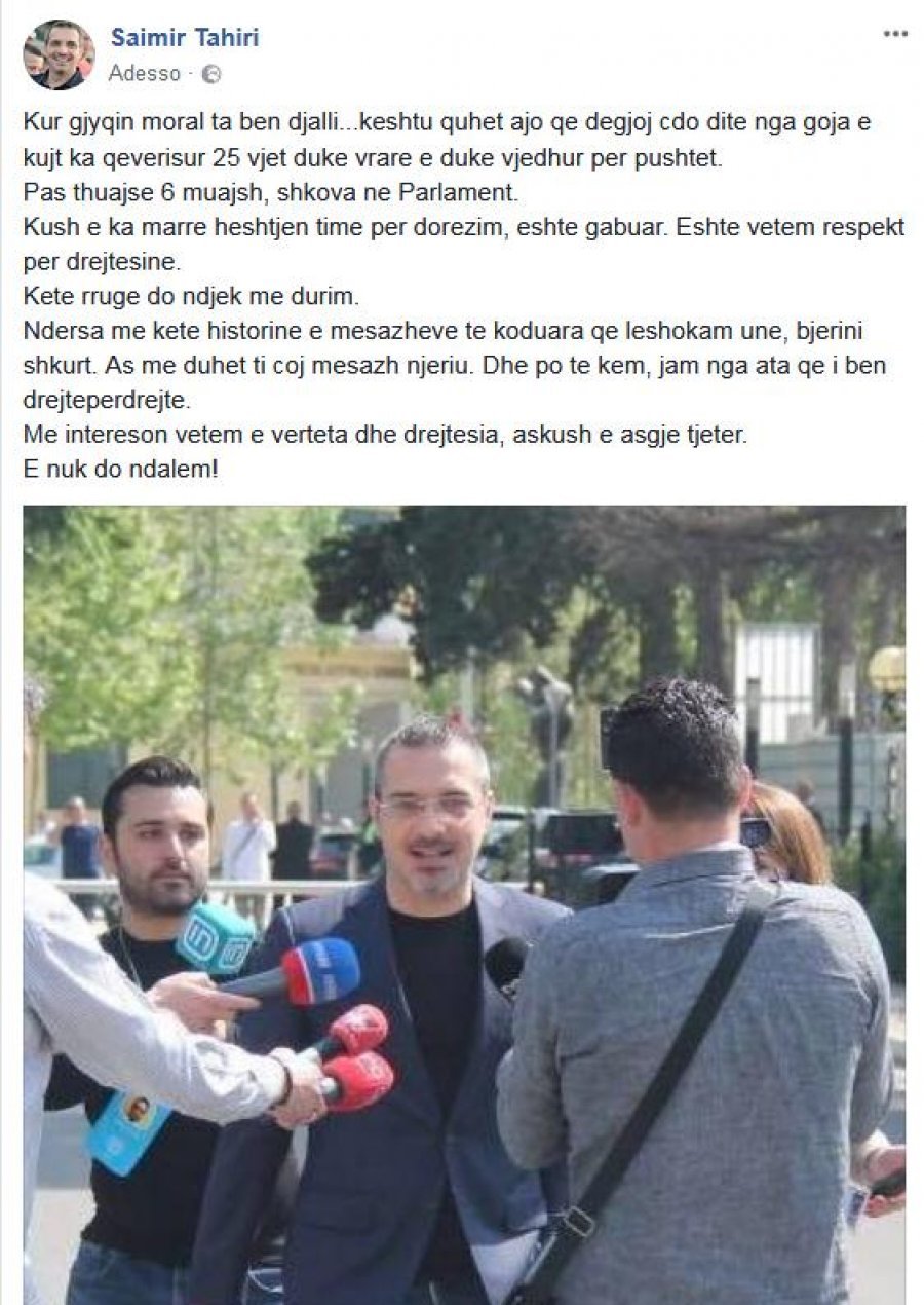 Pas deklaratës së bërë për gazetarët pasi doli nga Kuvendi, Tahiri ka vendosur të reagojë sërish, këtë herë në Facebook.