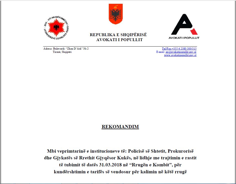 Arrestimet e 23 kuksianëve për protestën në Rrugën e Kombit janë me shkelje. Avokati i Popullit ka nxjerrë Raportin përfundimtar “Mbi veprimtarinë e institucioneve të: Policisë së Shtetit, Prokurorisë dhe Gjykatës së Rrethit Gjyqësor Kukës, në lidhje me trajtimin e rastit të tubimit të datës 31.03.2018 në ‘Rrugën e Kombit’, për kundërshtimin e tarifës së vendosur për kalimin në këtë rrugë”, për këtë rast, bashkë me rekomandimet që ka bërë për Policinë, Prokurorinë dhe Gjykatën.
