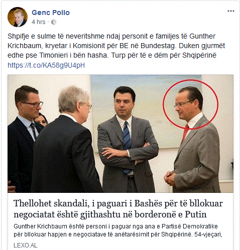 “Shpifje e sulme të neveritshme ndaj personit e familjes të Gunther Krichbaum, kryetar i Komisionit për BE në Bundestag. Duken gjurmët edhe pse Timonieri i bën hasha. Turp për të e dëm për Shqipërinë”, komenton Pollo që njihet gjithashtu si njohës shumë i mirë i politikës në Gjermnai dhe Austri.