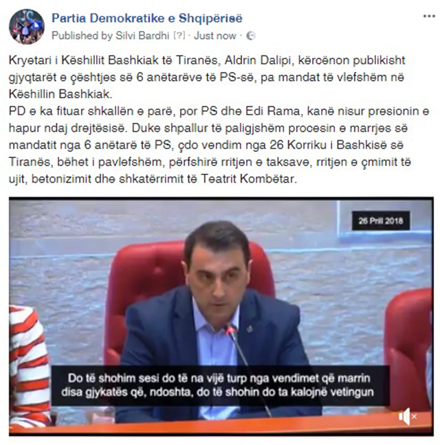 Kështu u shpreh sot PD, e cila në statusin e publikuar në rrjetet sociale, si me poshte. ka nxjerre një video ku duket Kryetari i Këshillit Bashkiak të Tiranës, Aldrin Dalipi, qe sipas tyre kërcënon publikisht gjyqtarët e çështjes së 6 anëtarëve të PS-së, qe PD thote se jane pa mandat të vlefshëm në Këshillin Bashkiak.