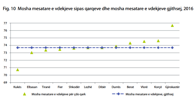 INSTAT raportoi se mosha mesatare e vdekjeve për vitin 2016 është 73,7 vjeç në rang vendi, ndërkohë që ka luhatje të dukshme në secilin qark. Qarku i Kukësit ka një shmangie të dukshme nga mosha mesatare gjithsej, duke u klasifikuar kështu në qarkun me moshën mesatare më të ulët të vdekjeve 70,7 vjeç.