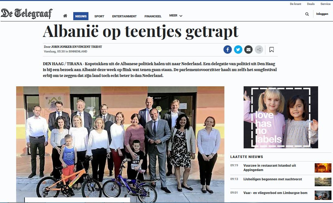 Gazeta më e madhe në Holandë “De Telegraaf” i ka kushtuar një shkrim deklaratave të fundit të kryeministrit Edi Rama dhe Kryetarit te Kuvendit Gramoz Ruci, për delegacionin me 8 deputetë holandezë që erdhën në Shqipëri për një mision faktmbledhës. Shkrimi shpreh çudine se si deputeti i parë iu përgjigj kritikave të holandezëve, duke folur për këngëtarët shqiptarë në Eurovizion dhe për fushën e futbollit. Gazeta raporton edhe për përgjigjen e Ramës, që vizita si ato të deputetëve holandezë e bëjnë për të qeshur.