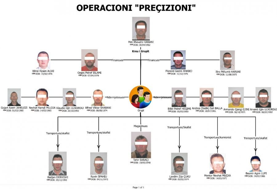 Në krye të skemës së hartuar në kuadrin e operacionit “Preçizioni” qendron Met Kanani; një radhë më poshtë, 4 financuesit e grupit kriminal; nën ta, tetë ndërmjetësit dhe kategoria e fundit, magazinuesi dhe 5 transportuesit me skafë dhe kamionë.