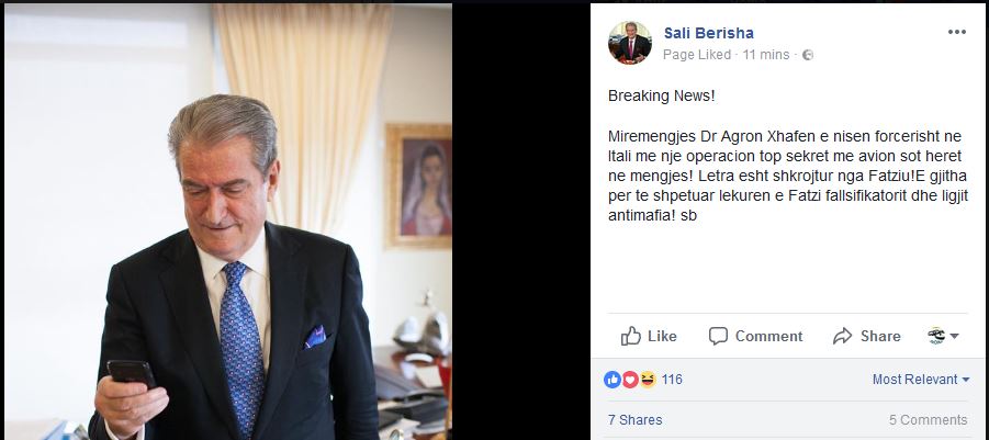 Ish-kryeministri Sali Berisha  ka denoncuar sot mashtrimin e radhës, sipas të cilit, vëllai i ministrit të Brendshme Agron Xhafaj, nuk është vetëdorëzuar, por është dërguar forcërisht nëpërmjet një operacioni top sekret dhe me avion të posaçëm, sot në mëngjes.