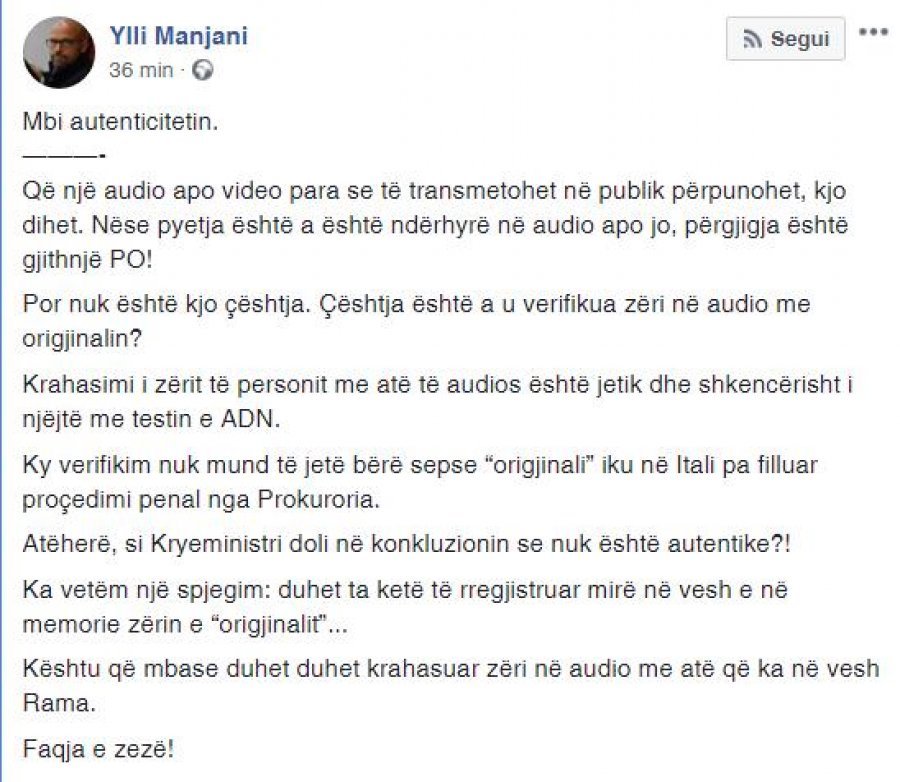 ”Krahasimi i zërit të personit me atë të audios është jetik dhe shkencërisht i njëjtë me testin e ADN. Ky verifikim nuk mund të jetë bërë sepse “origjinali” iku në Itali pa filluar proçedimi penal nga Prokuroria”, shkruan ai.