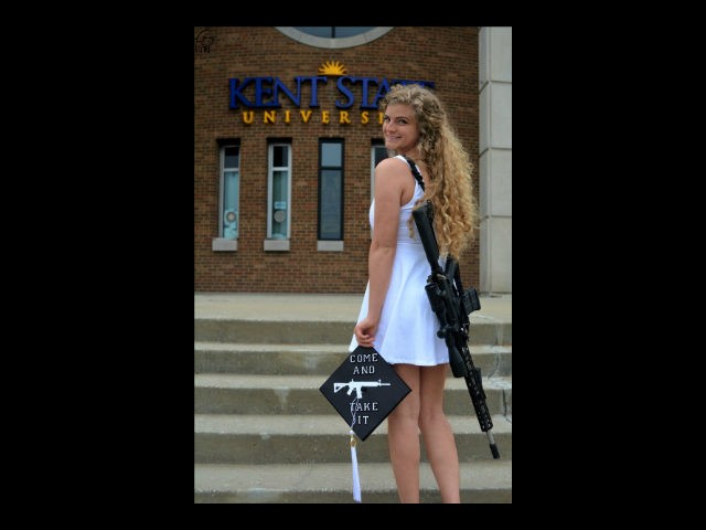 Ditën tjetër, 22-vjeçarja u kthye në  universitet me një pushkë gjysmë-automatike AR-10 të varur në shpinë dhe kapelen e saj të diplomimit shkruhej: “Eja dhe merre”.