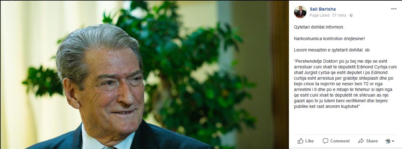 Ish-kryeministri Sali Berisha referuar qytetarit dixhital ka denoncuar sot se është arrestuar djali i xhaxhait te deputetit te PS, Jurgis Çyrbja. Sipas denoncimit te Berishës ai është arrestuar për grabitje shtëpish ndërkohe që lajmi po mbahet i fshehur, bashkë me përpjekjet për lirimin e tij.