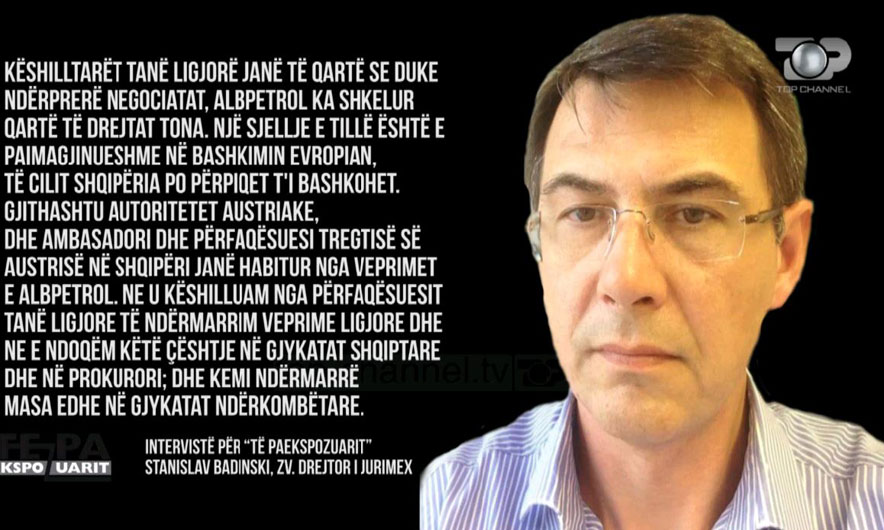 Në një intervistë ekskluzive për “Të Paekspozuarit”, zv. Drejtori i Jurimex, Stanislav Badinski, kompania austriake të cilës iu hoq koncesioni vitin e kaluar për 3 vendburimet e naftës Cakran, Gorisht dhe Amonicë, deklaron se do të hedh Shqipërinë në Gjykatën e Arbitrazhit, pasi kompania e tij është eleminuar padrejtësisht.