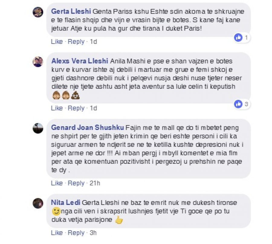 “Fajin me te mall qe do ti mbetet peng ne shpirt per te gjith jeten krimin qe beri eshte personi i cili ka siguruar armen te ndjerit se ne te ketilla kushte depresioni nuk i jepet arme ne dor !!! Ai mban pergj i mbyll komentet e mia flm per ata qe komentuan pozitivisht i pergezoj u prehshin ne paqe te dy”.