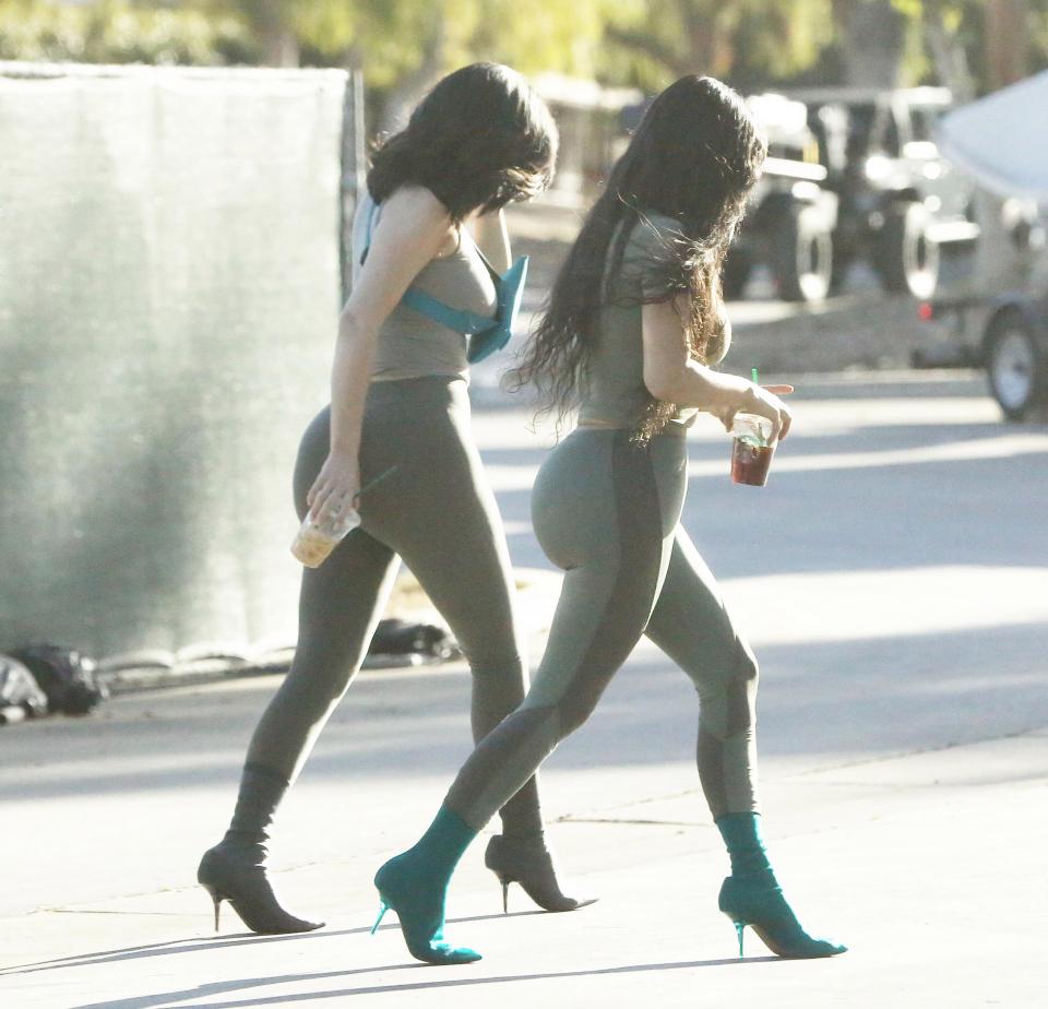 Kim Kardashian dhe Kylie Jenner duken të njësoj të veshura me tuta streche të shtrënguar pas vitheve dhe cizme me taka të larta nga linja Yeezy Kayne West në LA.