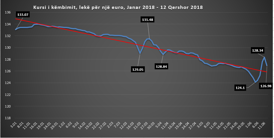 Aktualisht euro i është larguar kuotës së tij më të ulët të këmbimit prej 124.17 lekë por duket se rritja e papritur ishtë thejshtë një frikë e individëve të cilët vrapuan të blinin euro në treg, nga frika se ajo do të rritej më tej. Po sic duket ky nxitim kaq e pati, monedha e përbashkët po i kthehet sërish rënies së frikshme.