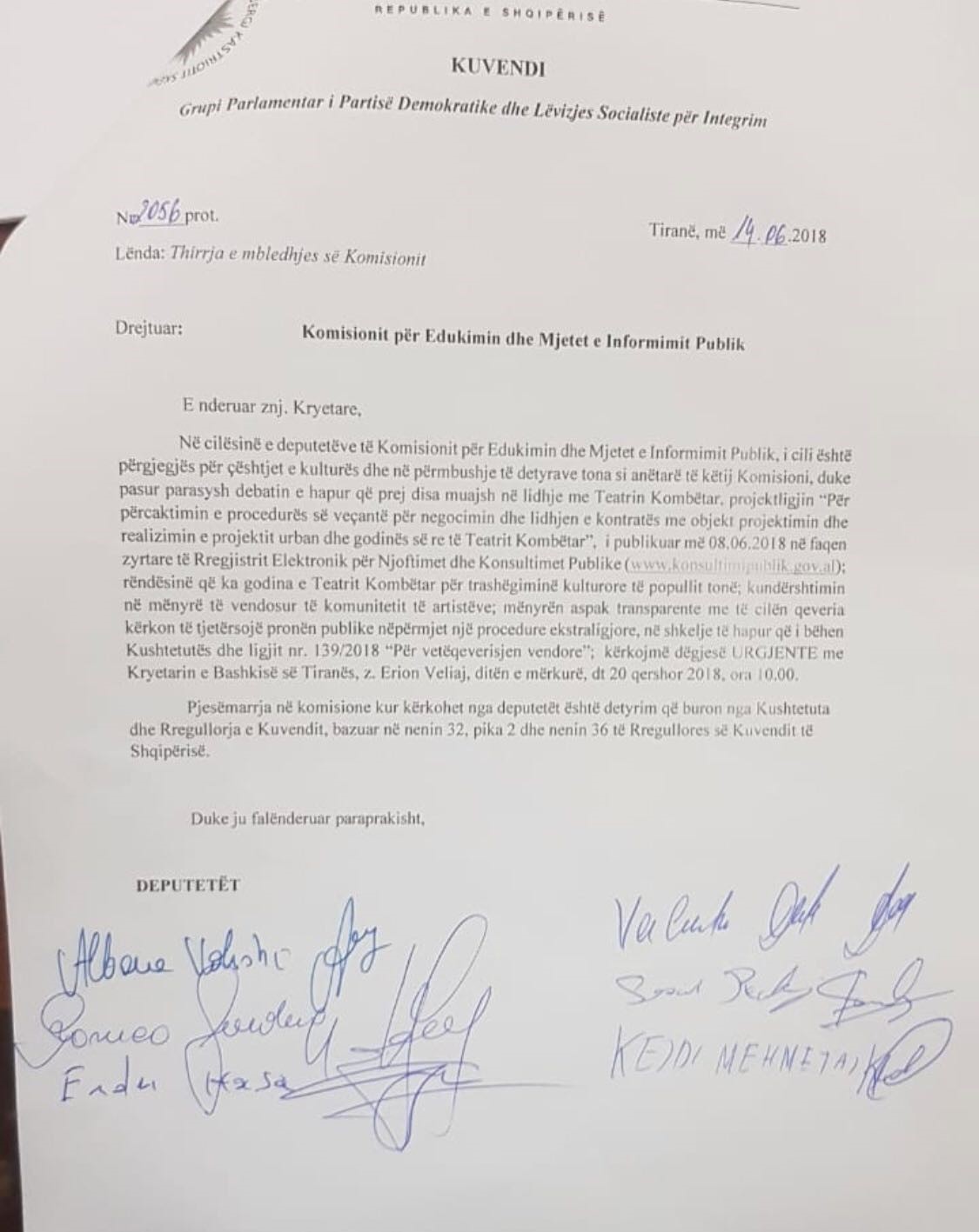 Në letër thuhet se në cilësisë e deputetëve të Komisionit për Edukimin dhe Mjetet e Informimit Publik, i cili është përgjegjës për cështjet e kulturës dhe në përmbushje të detyrave tona si anëtarë të këtij Komsionit duke patur parasysh edhe debatin e hapur para disa muajsh në lidhje me Teatrin Kombëtar, projektligjin “ Për përcaktimin e procedurës së vecantë për negocimin dhe lidhjen e kontratës me objekt përcaktimin dhe realizimin e projektit urban dhe godinës së re të Teatrit Kombëtar”, i publikuar më 08.06.2018 në faqen zyrtyare të Rregjistrit Elektronik për Njoftimet dhe Konsultimet Publike, rëndësinë që ka godina e Teatrit Komëbatr për trashëgiminë kulturore të popullit tonë, kundërshtimin në mënyrë të vendosur të komunitetit të artistëve, mënyrën aspak transparente me tw cilën qeveria kërkon të tjetërsojë pronën publike nëpërmjet një procedure ekstraligjore në shkelje të hapur që i bëhen Kushtetutës dhe ligjit nr. 139/2018 “ Për vetëqeverisjen vendore” kërkojmë dëgjesë URGJENTE me Kryetarin e Bashkisë së Tiranës, z. Erion Veliaj, ditën e mërkurë dt. 20 qershor 2018, ora 10.00.”