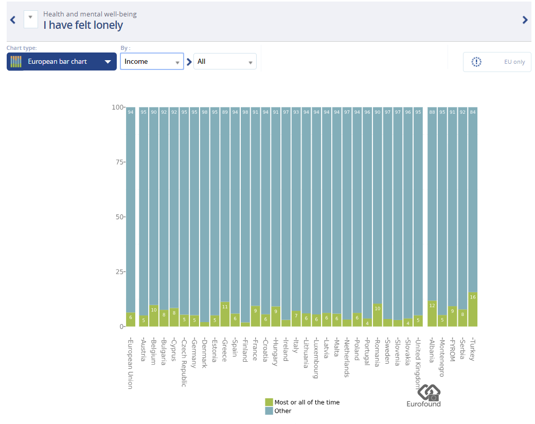 Në të gjithë BE-në, ky tregues është 6%. Për çdo europian që ndihet vetëm, ka dy shqiptarë që kanë pohuar që ndihen vetëm gjatë gjithë kohës, ose pjesën më të madhe të kohës.