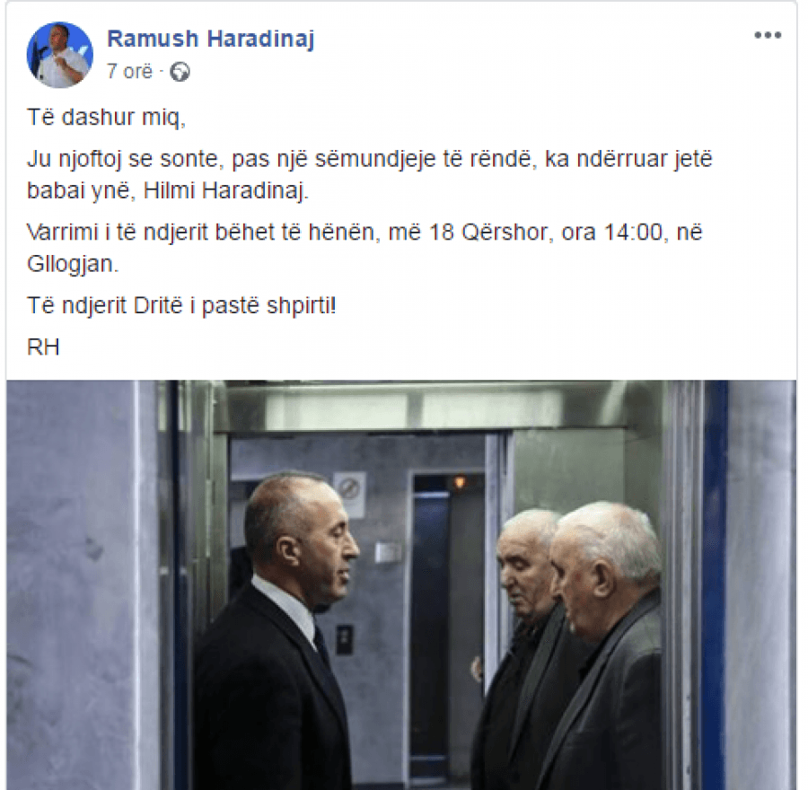 Ju njoftoj se sonte, pas një sëmundjeje të rëndë, ka ndërruar jetë babai ynë, Hilmi Haradinaj.
