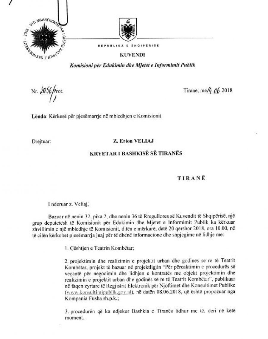 Deputetët e Partisë Demokratikë kanë thirrur sot në interpelancë ministren e Kulturës, Mirela Kështu tregon edhe dokumenti i mëposhtëm ku thuhet se sot është thirrur në Komision vetëm Mirela Kumbaro dhe kryebashkiaku i Tiranës e ka radhën nesër.