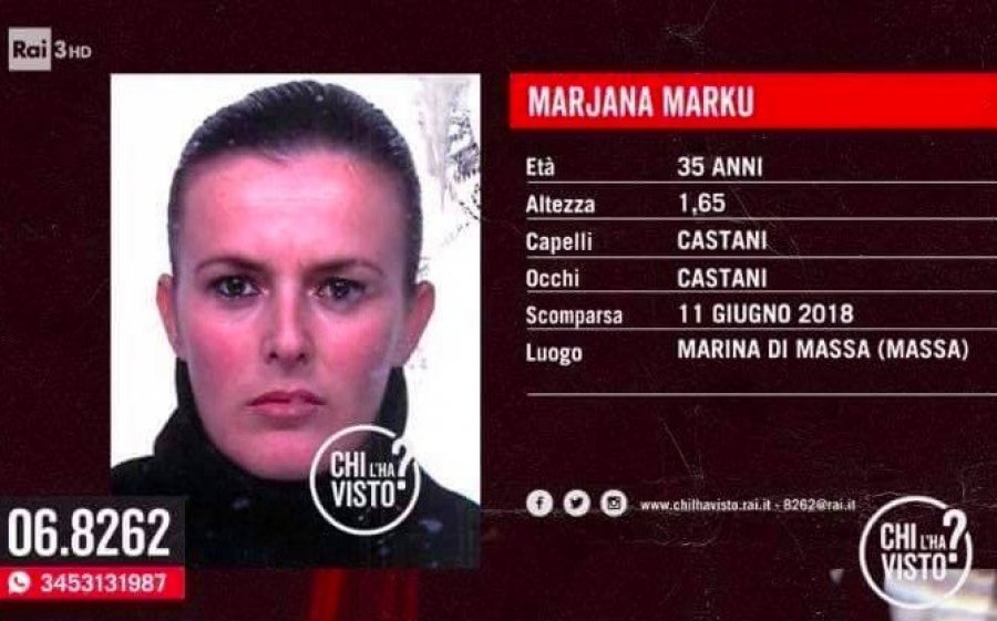Mediat italiane raportojne për një grua shqiptare të zhdukur të zhdukur prej ditësh. Rasti i saj u bë publik në emisionin “Chi l’ha visto?” i transmetuar në Rai3. Gruaja shqiptare me banim në komunën italiane “Marina di Massa” është raportuar nga familjarët e zhdukur se është zhdukur që prej 11 qershorit 2018.