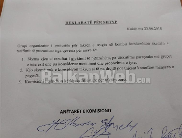 “Skema vjen si rezultat i gjykimit të njëanshëm pa diskutime paraprake me grupet e interesit dhe pa konsideruar mendimet dhe propozimet e tyre. Kjo skemë nuk e konsideron taksën si të pa drejtë por thjesht kamuflon mënyrën e pagesës. Komisioni i qëndron kërkesës fillestare për taksën zero. Në rast të mos marrjes në konsideron te peticionit të këshilltarëve të tre bashkive dhe kërkesave të komisionit të protestës do protestojmë si e e vetmja alternativë”,- thuhet në një deklaratë të tyre, siç mëson “BalkanWeb”.
