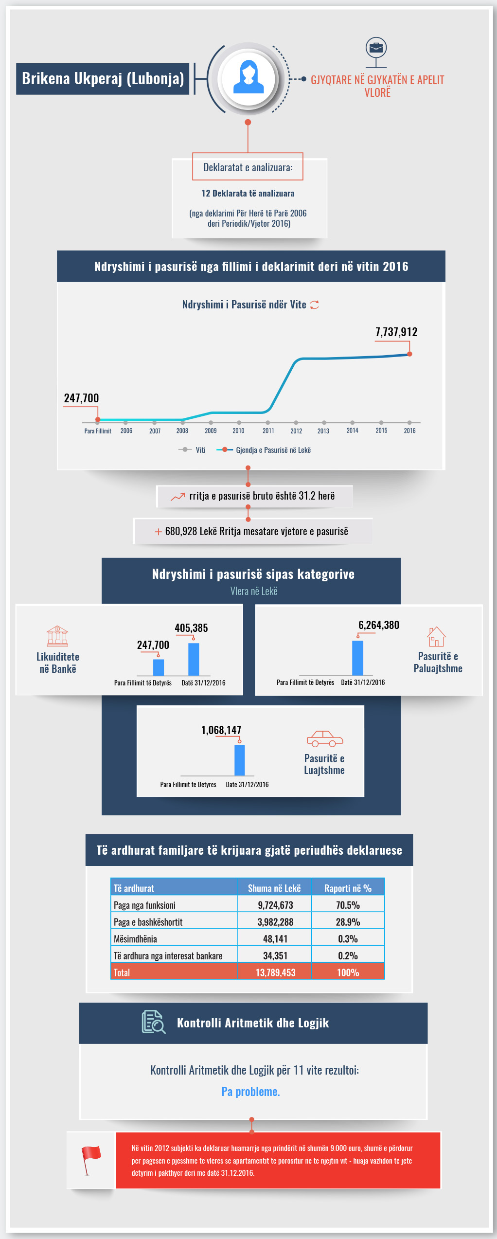 Analiza e pasurisë është një ndër tre shtyllat e rivlerësimit për gjyqtarët, së bashku me kontrollin e figurës dhe vlerësimin e aftësive profesionale. Skeda grafike e mëposhtme paraqet ndryshimin e pasurisë së deklaruar të gjyqtares Brikena Ukperaj (Lubonja) nga viti 2006 deri në fund të vitit 2016.