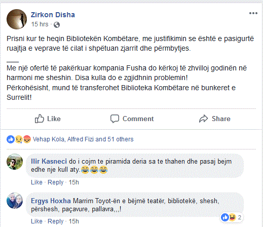 Disha disa orë më parë kishte reaguar në “Facebook” edhe për indiferencen e autoriteteve më të larta për t’i ardhur në ndihmë stafit të Biblotekës Kombëtare dhe ta shfrytezonin kete rast per te ngritur kulla, si ne rastin e Teatrit Kombetar.