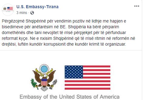 Një ditë pas vendimit për shtyrjen e hapjeve së negociatave me Bashkimin Europian, Ambasada Amerikane ka reaguar në rrjetin social facebook.