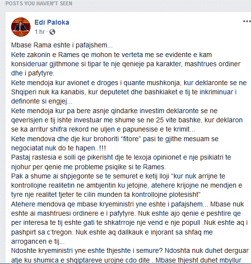 Kete mendoja kur avionet e droges i quante mushkonja, kur deklaronte se ne Shqiperi nuk ka kanabis, kur deputetet dhe bashkiaket e tij te inkriminuar i definonte si engjej…
