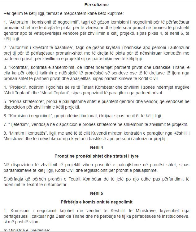 Duke shmangur procedurat ligjore ekzistuese për menaxhimin e pronës publike si dhe ligjin ekzistues të partneritetit publik-privat, qeveria shqiptare ka miratuar projektligjin e jashtëzakonshëm për t’i dhënë kompanisë Fusha sh.p.k pa garë tokën e Teatrit Kombëtar.