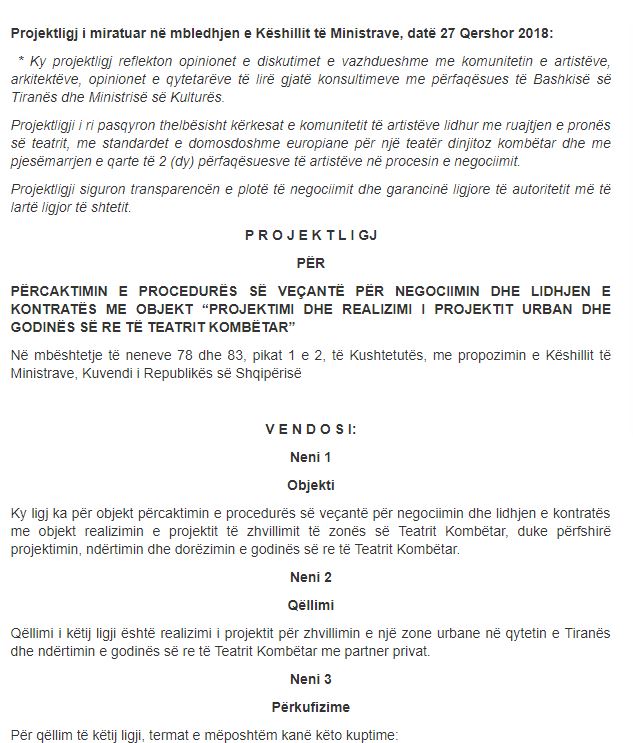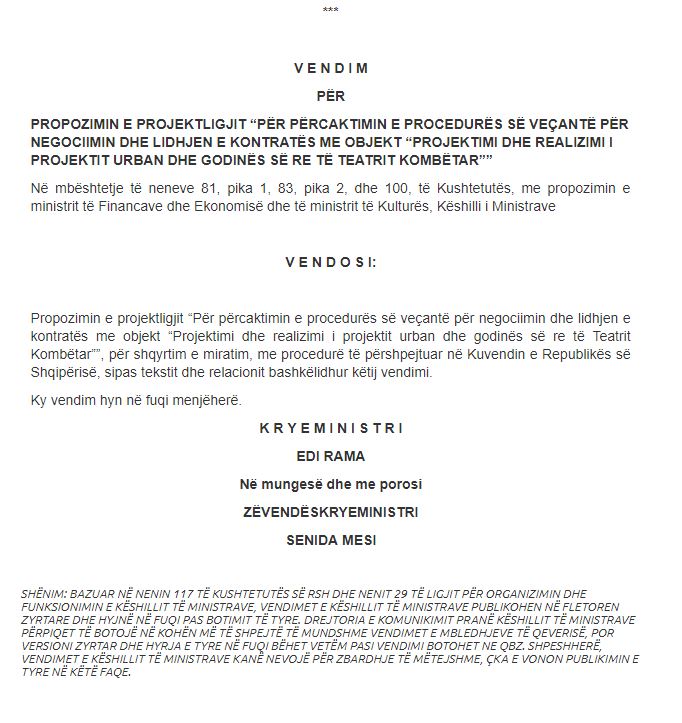 Pak kohë pasi kreu i bashkisë, Erion veliaj, njofoi se kishte arritur marrëveshjen me artistët për cështjen e Teatrit dhe ndërtimin e një teatri të ri, Qeveria kalon në mbledhjen e djeshme projektligjin për “Përcaktimin e procedurës së veçantë për negociimin dhe lidhjen e kontratës me objekt “projektimi dhe realizimi i projektit urban dhe godinës së re të teatrit kombëtar”.