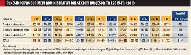 Pra ky tregues jep numrin e personave që fillojnë punë dhe paguajnë rregullisht sigurimet. Sipas të dhënave administrative, në total, në Shqipëri kishte 1,127,772 të punësuar, nga të cilët 501,759 ishin në sektorin privat jobujqësor, 164,333 në shtet dhe 461,680 në sektorin privat bujqësor (numri mesatar i të punësuarve në sektorin bujqësor bazohet në vlerësimet tremujore të Anketës së Forcave të Punës). Në total, numri i të punësuar në tremujorin e parë, në krahasim me të fundit 2017, u rrit me 5,137 persona, nga të cilët 418 më shumë në sektorin privat jobujqësor dhe 4,866 në bujqësi.